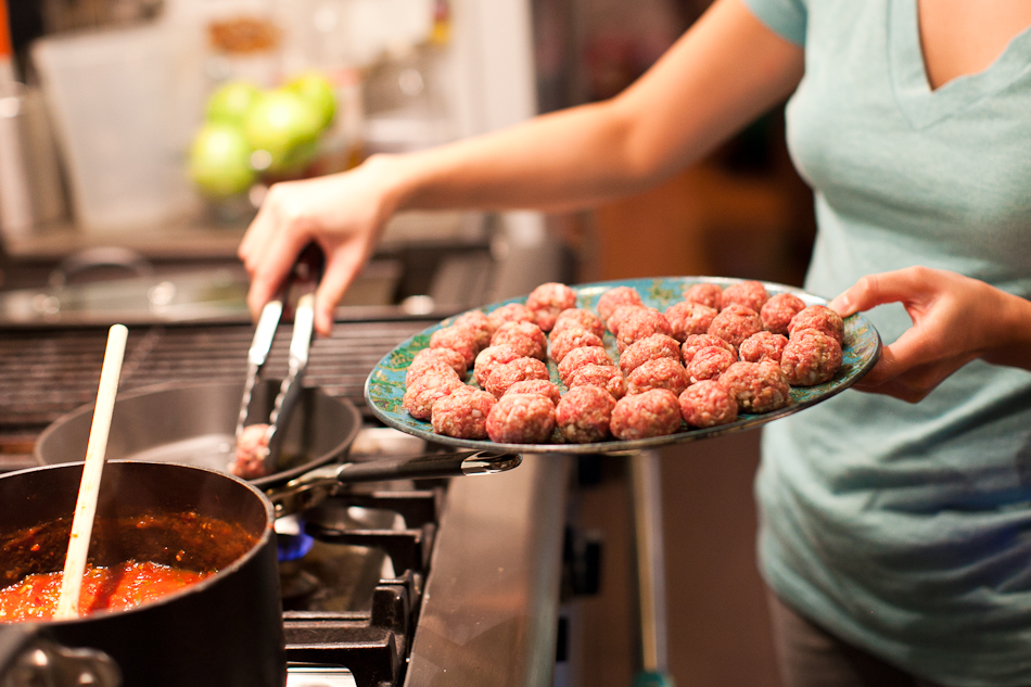 Mix all ingredients in a large bowl. The meat should be a moist consistency, not too wet or the meatballs will fall apart. Be sure not to handle the meat too much or it becomes mushy. Once everything is nicely mixed, roll the meatballs into about quarter size balls. Heat a medium frying pan with some olive oil and fry till brown on all sides. Set aside till ready to use.